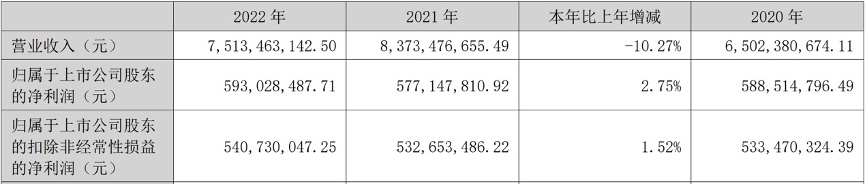 箭牌家居公布的2022年业绩显示,公司营收同比下降10.27%至75.13亿元,实现归属于上市公司股东净利润(下称归母净利润)则较上年同期微增2.75%,为5.93亿元。