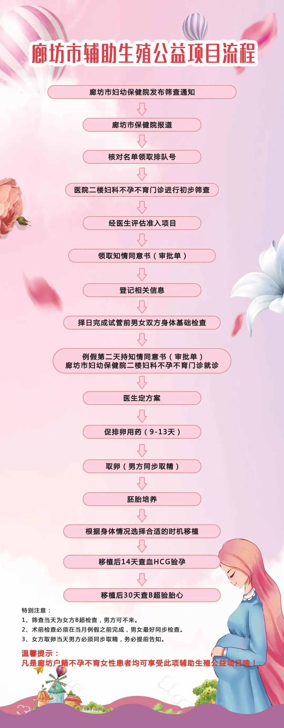 “贯彻“健康中国”战略,实施“健康廊坊”,就要从“健康家庭”抓起。每个家庭、每个成员的健康问题解决了,“健康廊坊”就实现了。为践行“健康中国”国家战略,根据廊坊市卫健委与北京联慈健康扶贫基金会的孕前关爱-辅助生殖公益项目合作协议要求,配合市卫健委实施“关爱新生命—辅助生殖公益项目”。2020年9月29日,廊坊市辅助生殖公益项目在廊坊市妇幼保健院正式启动。该项目实施,是通过减免辅助生殖技术中体外受精试管婴儿医疗费用,帮助更多患者及早进行不孕不育治疗。对符合手术条件的,公益基金会垫付辅助生殖医疗费用,个人无需支付费用。手术成功患者,承担全部费用的20%(最高2万元),以支持更多的家庭享受生殖技术服务;手术不成功患者,不承担费用,可申请二次手术。