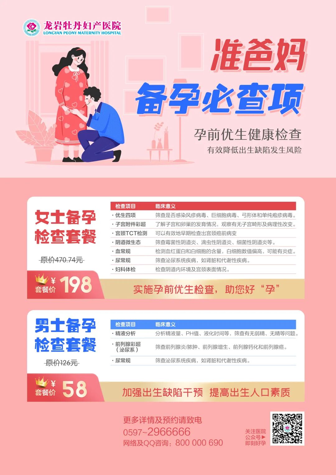 孕前检查是杜绝遗传疾病,预防先天残疾,优生优育的必要前提。它可以帮助备孕人群,在孕前发现问题或异常。及时治疗和避免潜在问题,把身体调节到最佳状态!龙岩牡丹妇产医院推出女性男性孕前检查套餐。