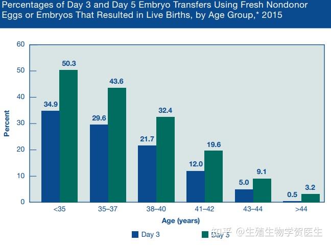 从中我们可以看到,<35 岁的女性在第 5 天的活产率最高(50.3%),并且随着年龄的增长开始下降(到 44 岁后降至 3.2%)。请注意,这些是国家统计数据,查看近 100,000 个周期的平均值,涵盖各种等级、诊断和移植的胚胎数量。