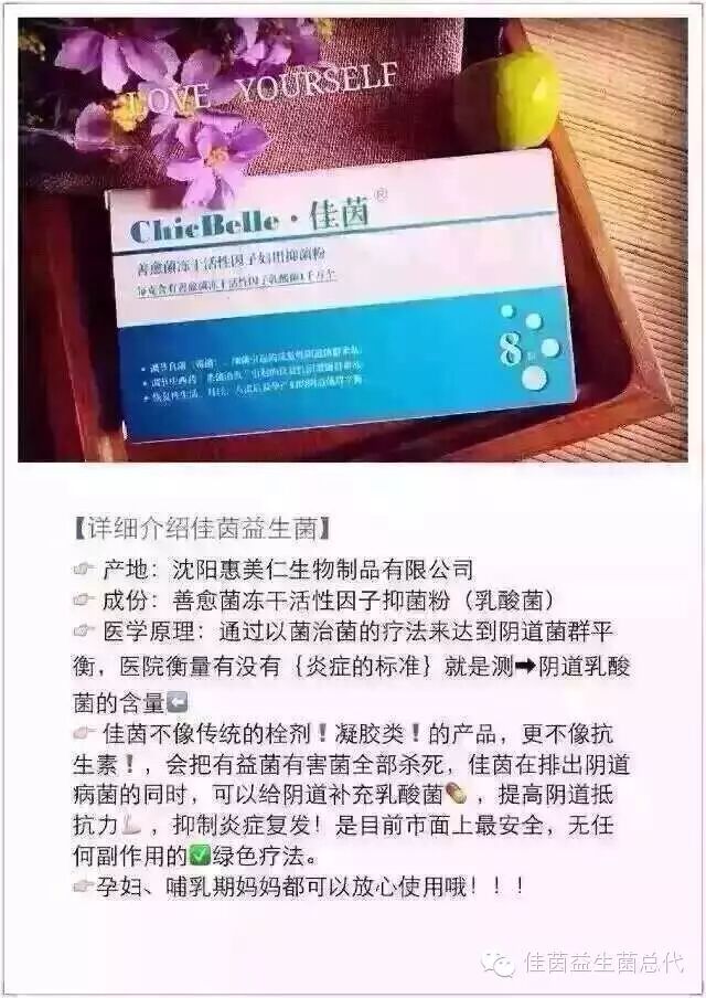 佳茵益生菌就是乳酸菌,它不是药品,是消字号。对人体无任何伤害,可长期使用,孕妇、哺乳期也均可使用。调节阴道内真菌(霉菌)、细菌引起的反复性阴道群菌紊乱。调节中西药"杀菌消炎"引起的反复性阴道群菌紊乱。恢复由于人流、宫颈子宫类手术后、月经、性生活及孕产妇造成的阴道群菌平衡。 调节由妇科疾病导致的不孕、月经不调、腰酸