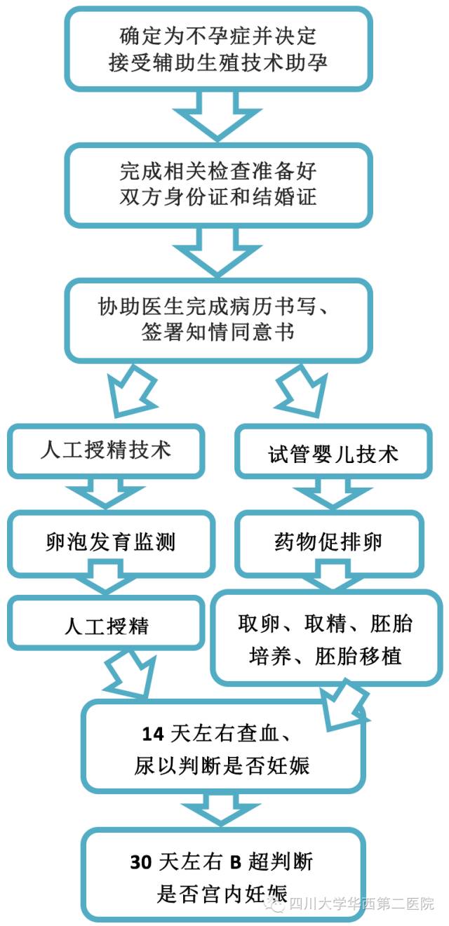 辅助生殖技术的整个流程是怎样的?完成必须检查后,将检查资料提交医生审阅,排除不能进行辅助生殖技术助孕的情况后,到医院完成病史询问、体格检查并协助医生完成病历书写,签署相关知情同意书,根据女方卵巢功能和月经情况确定开始时间。接受人工授精的女性,一般在月经第8~10天开始接受B超对卵泡发育的监测,当医生判断卵泡即将破裂或破裂后不久,就会决定实施人工授精。接受丈夫精液人工授精者,则男方取精,交由实验室技术人员处理后由医生注入到女方子宫腔内,接受精子库供精人工授精者,则医院将会解冻与男方血型尽量一致的精液,处理后由医生注入到女方子宫腔内。人工授精实施14天后未来月经,则查血或尿来判断是否怀孕,当然人工授精14天内就已经来月经了,多为本次技术受孕失败。