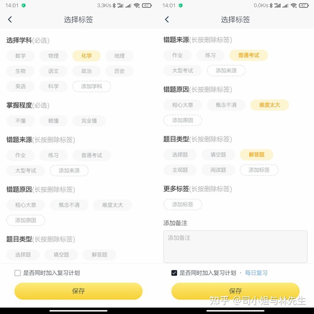错题拍照扫描之后分类非常的详细,如课程,掌握程度,错题来源,错题原因,题目类型等,是否加入每日复习计划,在保存错题的时候都可以设置。