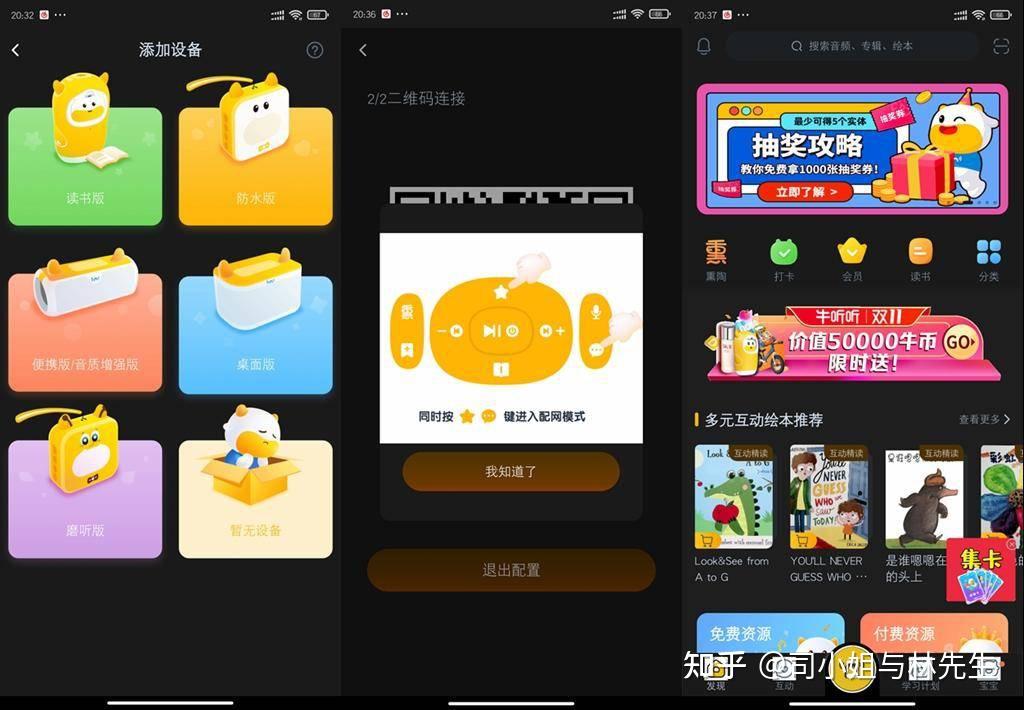 牛听听的这台机器其实官方定义是熏听,英语,语文,数学,同时集成语音内容接入了喜马拉雅和蜻蜓FM等互联网软件,除了学习的功能之外,还附加了很多有声内容。