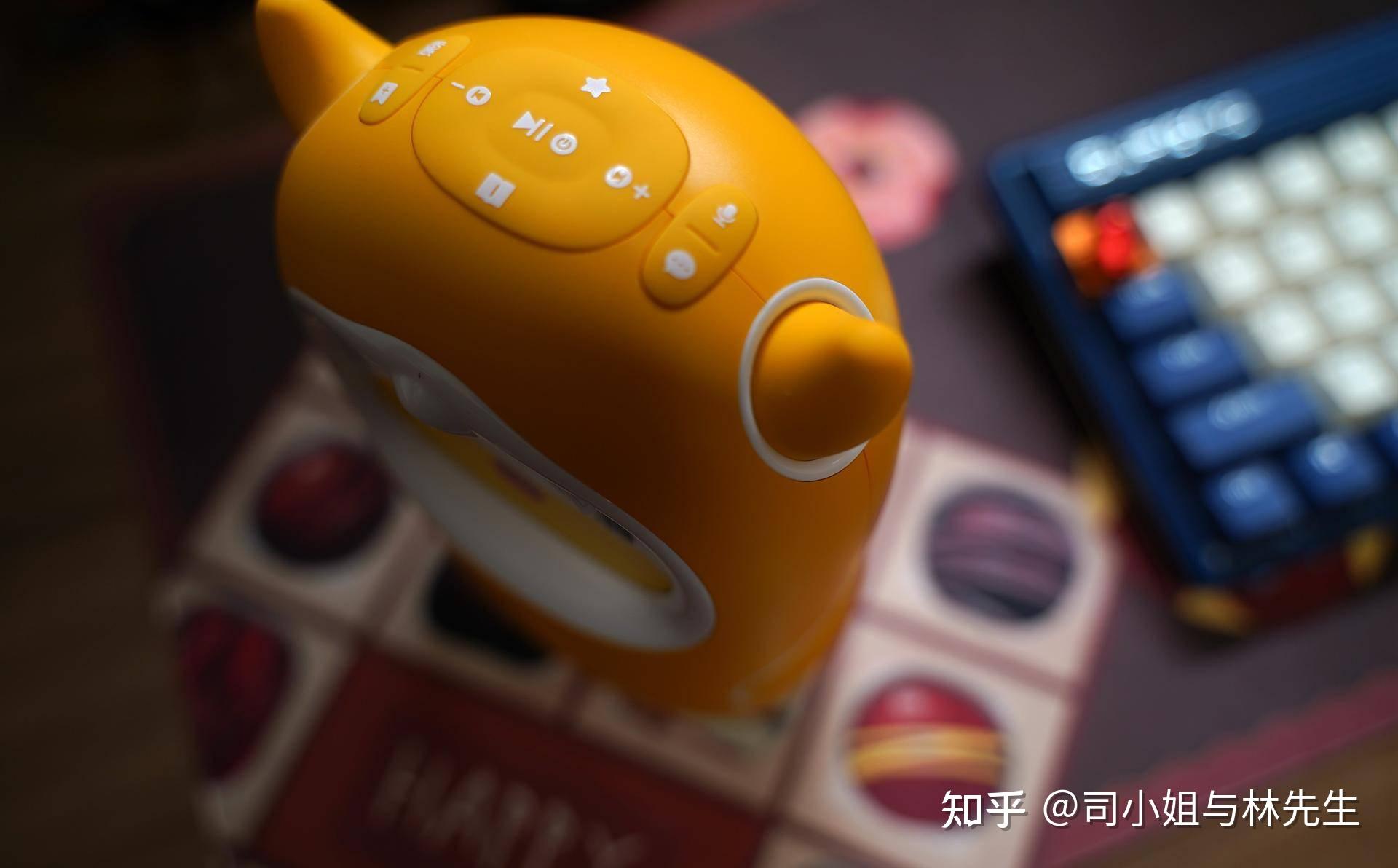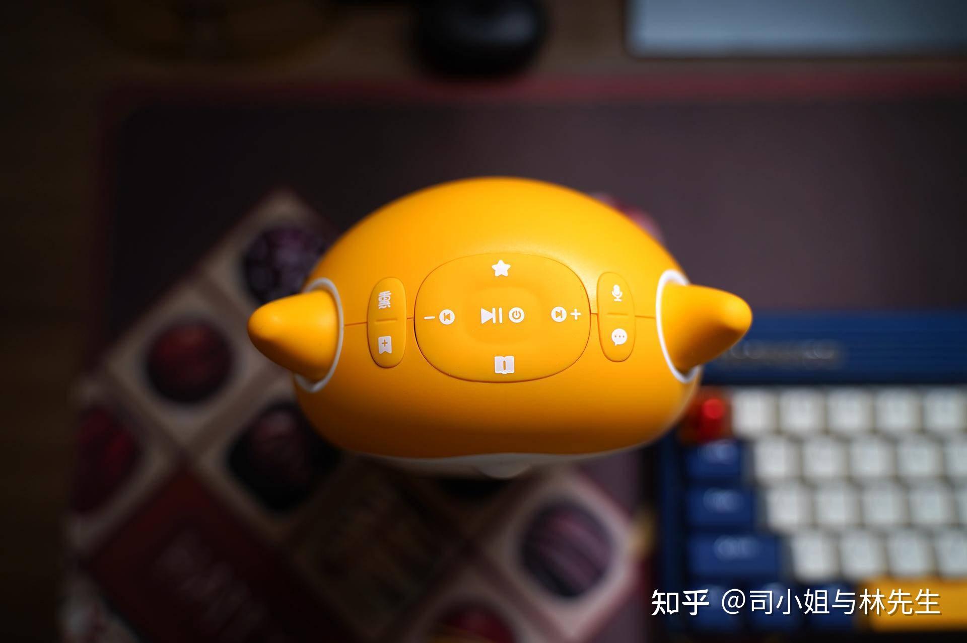 可爱和很萌动的两个牛角还有顶部的按键,分别是熏听键,收藏键,喜欢的内容可以支持一键收藏,上一首下一首,暂停开始键,读书键,信息按键,同时也支持语音互动按键。