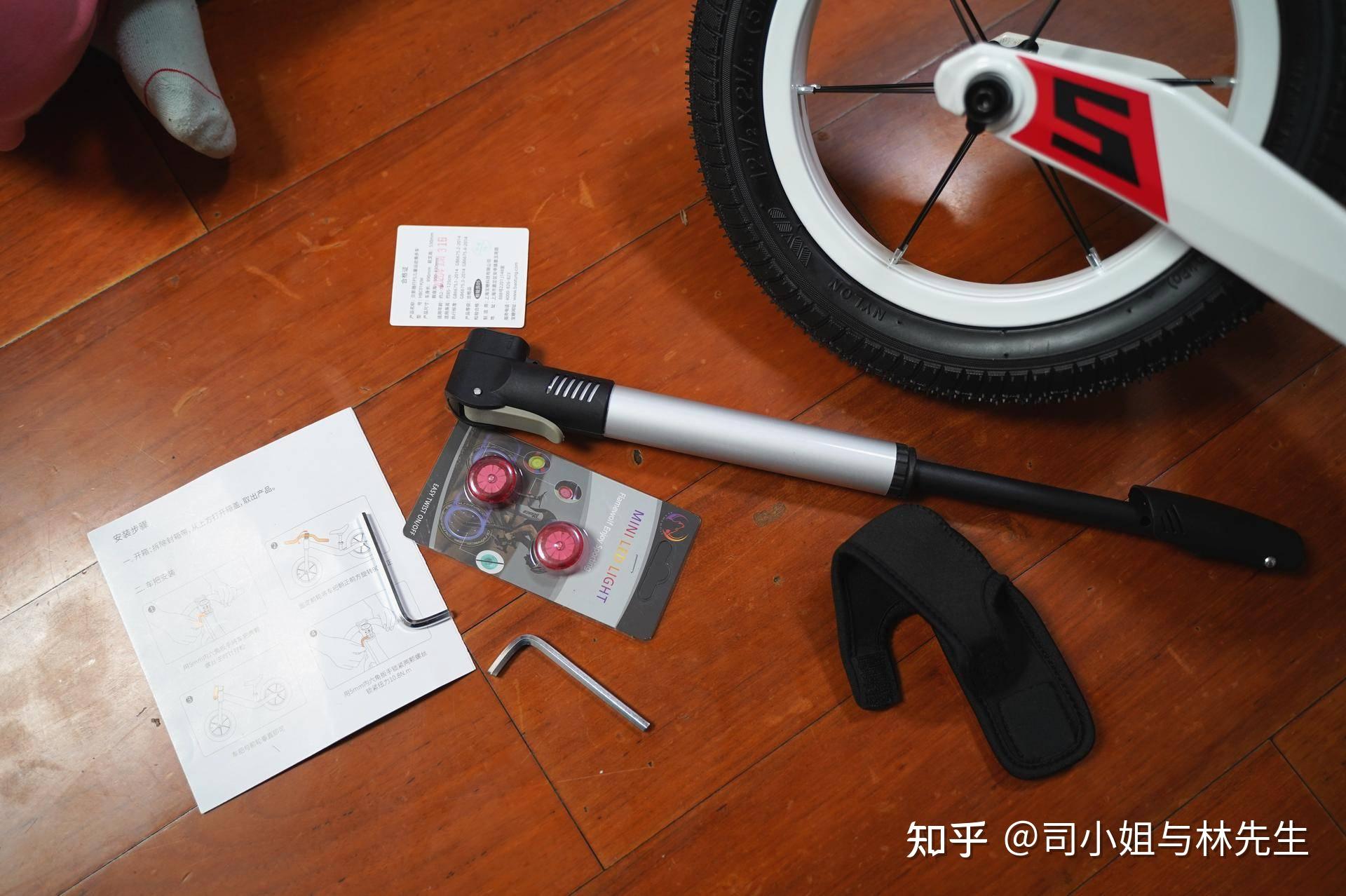 贝影随行F5还附送一个打气筒还闪光装饰灯,不过这个灯并不是震动感应的,需要手动拧一下才会亮。打气筒也比较适用,另外附送了两个内六角螺丝刀,主要是用于固定和调整把手和车座位。由于车座可以根据儿童的身高来调整。