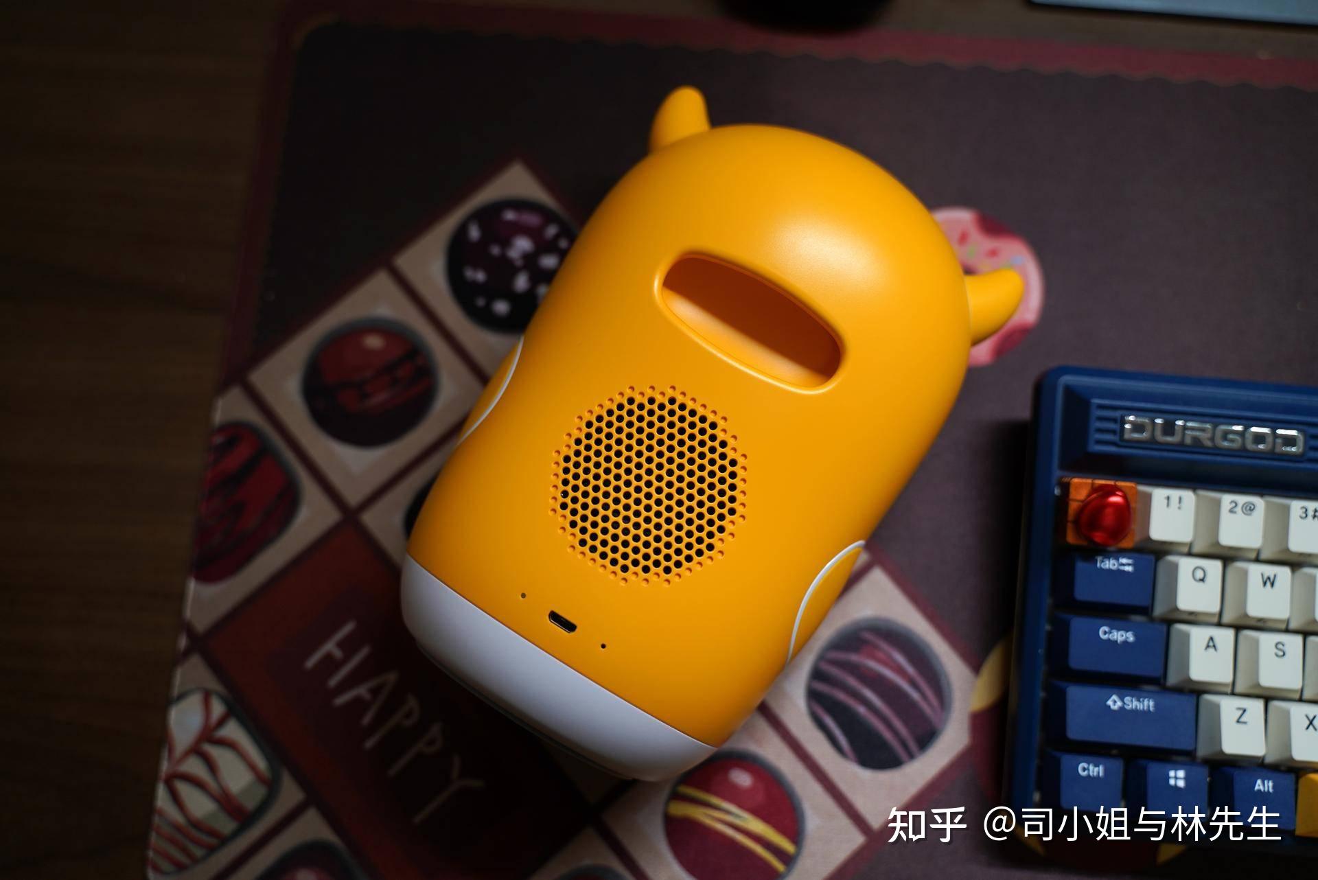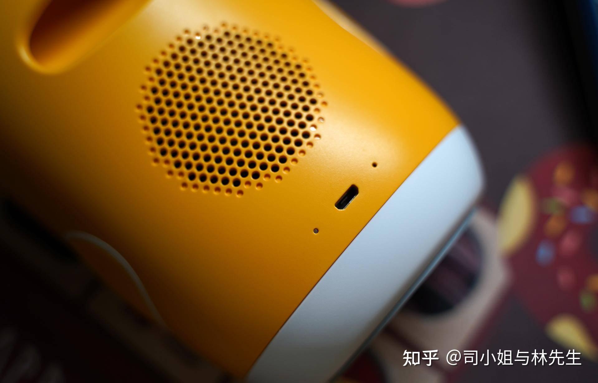扬声器设计在背面,还特别设计了一个把手,适合小孩子随手拿起来,之前家里的火火兔经常的被摔,主要是机器本身没有可以抓握的地方,这个设计的把手十分的好用。但是充电器配置了一个MicroUSB有点落伍了。这点还是希望能标配C口充电。