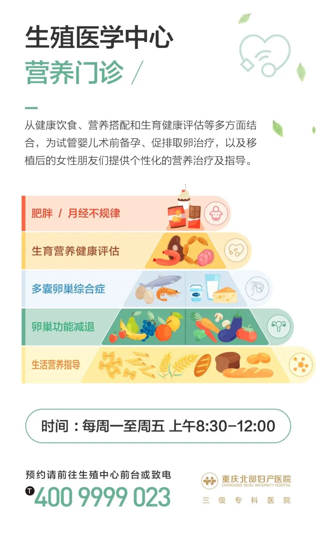 我们特别邀请到公立三甲医院资深营养科专家及其团队于我院开展公益咨询,为试管婴儿术前准备,促排卵治疗,以及移植后孕初期的宝妈们提供专业的营养建议,从健康饮食、营养搭配和生育健康评估等多方面结合,制定个性化的营养健康评估,提升精、卵质量,为不孕症的治疗提供有效的帮助!