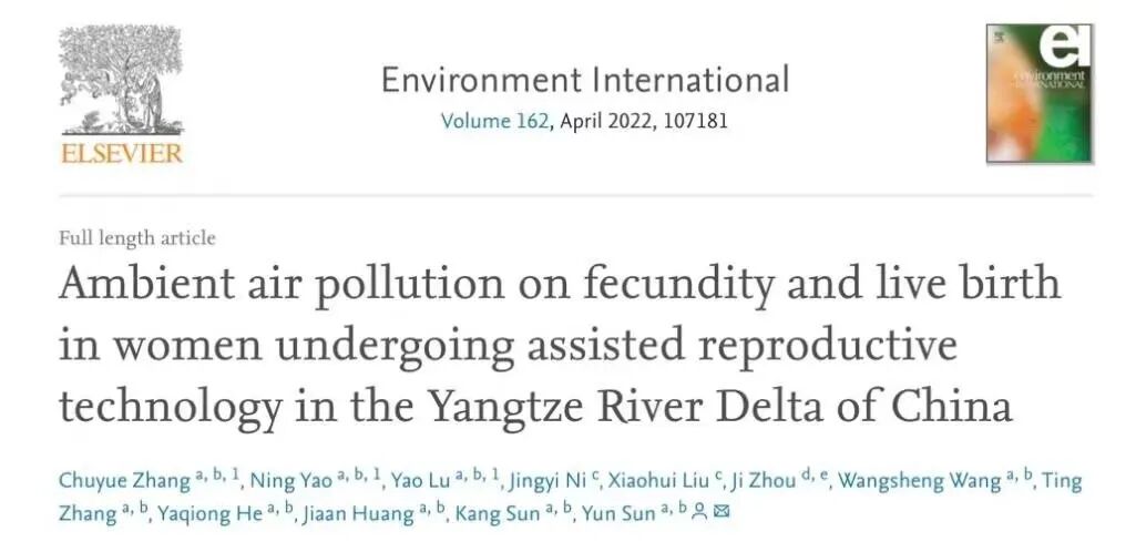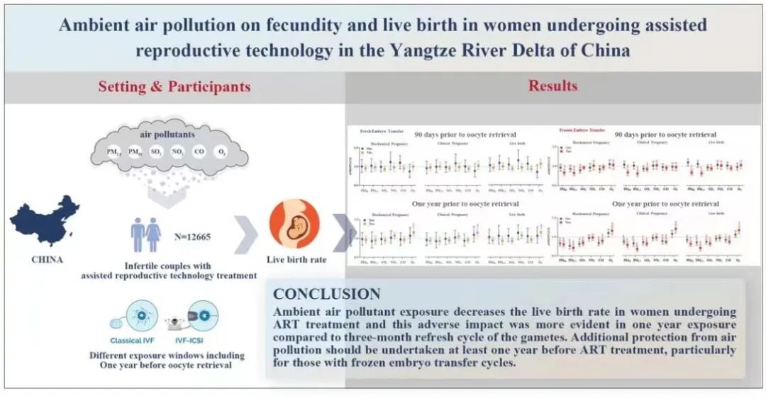 近日,上海交通大学医学院附属仁济医院生殖医学科孙贇教授团队在环境健康领域国际权威期刊《环境国际》(Environment International,影响因子IF=11.694)发表最新研究成果,发现空气污染物暴露显著降低试管婴儿助孕女性的活产率。研究结果提示,试管助孕夫妇应尽早做好个体化保护措施,改善居住环境空气质量,减少可避免的粉尘、尾气暴露。