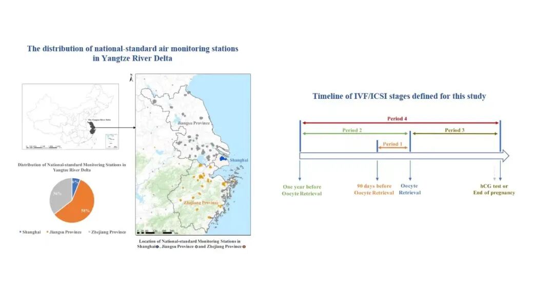 在本项回顾性研究中,孙贇教授团队借助仁济医院生殖中心的区位优势,研究了2015年至2019年来自长三角地区于我院生殖中心进行IVF或ICSI助孕的12665对夫妇,其中包括4085个新鲜胚胎移植周期以及8580个冻胚移植周期。利用长三角地区149个空气质量国控站点数据及纳入研究夫妇的具体地址,获取个体所受污染物的时间及空间暴露值。