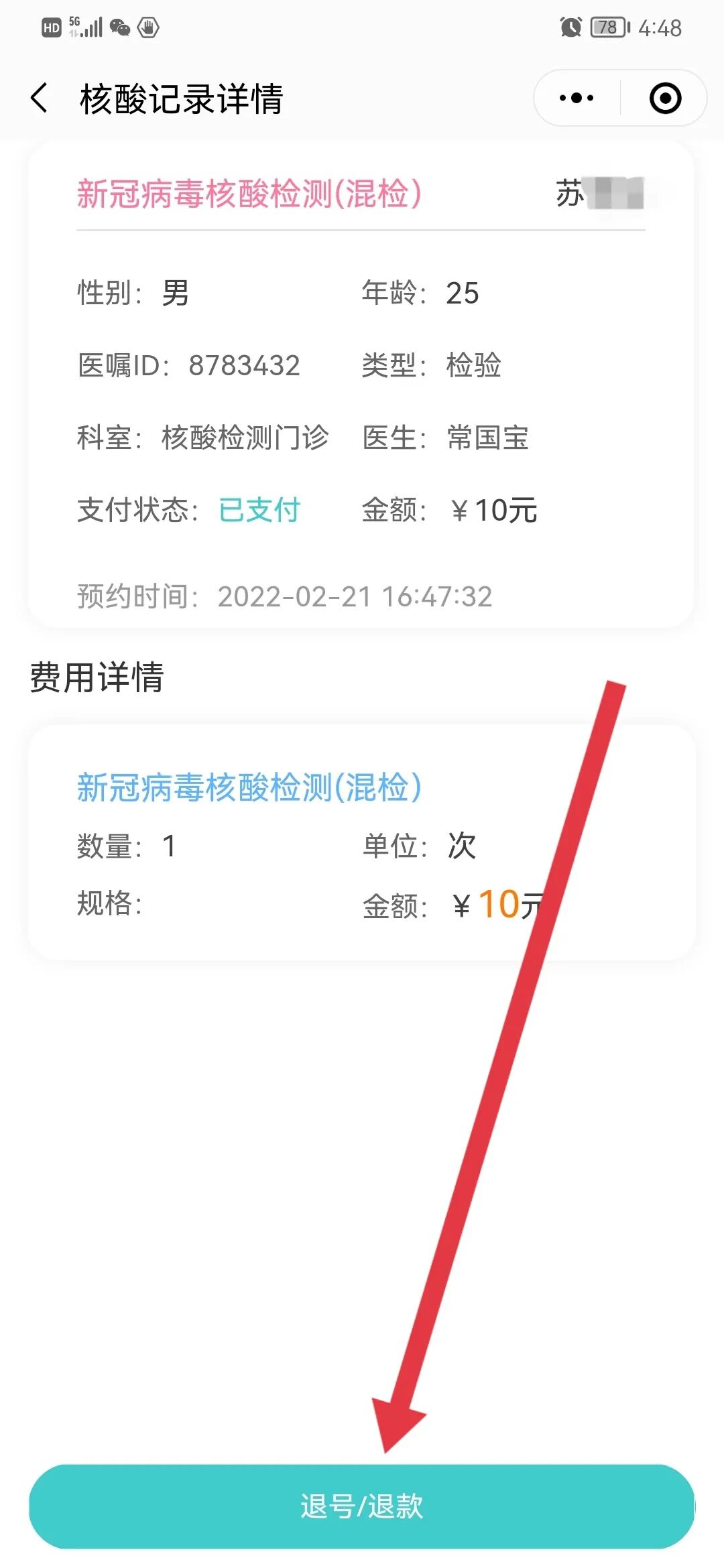 3.点击退号/退款,费用原路返回