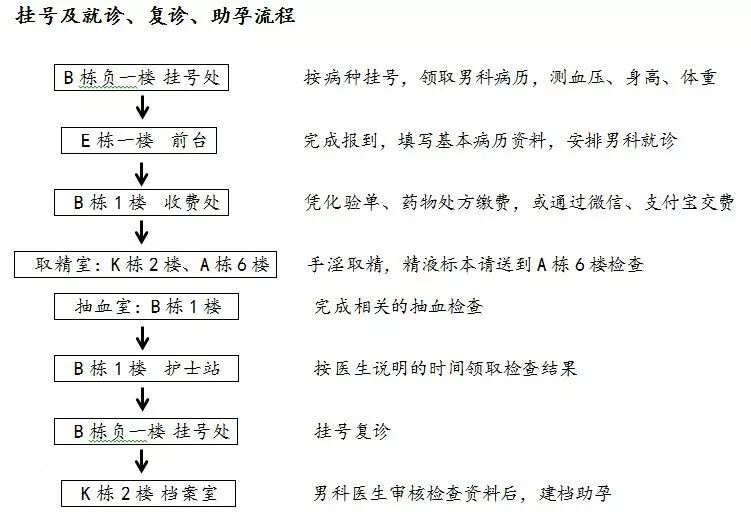 每次来我院,即使是陪同太太就诊,都请带齐男科门诊病历、本资料卡以及所有检查结果,以免贻误诊疗;人工授精或“试管婴儿”前的所有检查结果应先交给男科医生评估,再交到档案室建档。