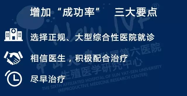 虽说无法做到100%的成功,但其实增加成功率的方法也是有很多的,比如趁年轻赶紧接受治疗、保持合适的体重、养成良好的饮食习惯与生活方式、保持放松的心情等等,具体内容这里不一一叙述,可关注本微信公众号“中山大学附属六院生殖中心”查看往期内容,可以发现有很多与助孕相关的科普知识。