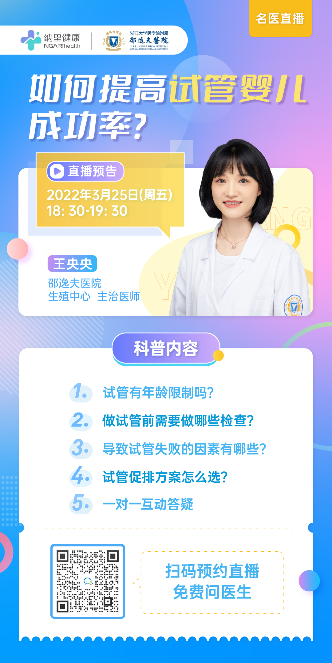 直播预告3月25日 18:30-19:30 生殖中心主治医师 王央央为大家分享「如何提高试管婴儿成功率」